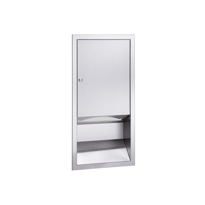 Recessed towel dispenser shall be fabricated of stainless steel with exposed surfaces in satin finish. Door with full length piano hinge and secured by tumbler lock. Towel dispenser capacity 800 multi-fold or 600 C-fold towels.