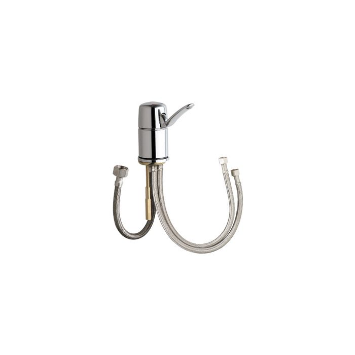 Chicago Faucets No. 2303-ABCP polished chrome plated solid brass construction. 4 5/8" metal lever handle(s) with blue and red temperature indicator. Integral inlet shank(s) contains standard 3/8" O.D. Copper supply tube inlets. Mounting hardware included. This product meets ADA ANSI/ICC A117.1 requirements and is tested and certified to industry standards: ASME A112.18.1M, CSA B125.1, and Certified to NSF/ANSI 61, Section 9 by CSA.