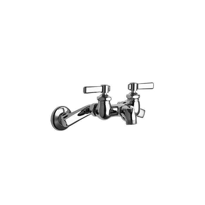 Chicago Faucets No. 305-RCP, polished chrome plated solid cast brass construction. Rigid spout with pail hook and 3/4" male garden hose thread outlet. 2-3/8" metal lever handles with eight-point tapered broach and secured, color-coded index buttons. Quaturn™ quarter-turn renewable compression cartridge designed to close with water pressure, with square tapered broach feature to help facilitate handle removal. 1/2" NPT female inlet supply arms with adjustable centers from 4" to 8-3/8", with loose wall flange. This product meets ADA requirements and is tested and certified to ASME A112.18.1 and CSA B125 industry standards.