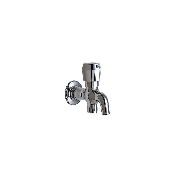 Chicago Faucets No. 324-665PSHCP polished chrome plated solid brass construction. 1 3/4" metal MVP metering push handle(s) with blue or red button. Mvp™ self-closing, auto-timed metering cartridge, adjustable run time from 2 to 15 seconds, opens with push, 0.25 gallon/cycle. Integral inlet shank(s) contains standard 1/2" NPT female thread inlet with integral wall flange. Mounting hardware included. This product meets ADA ANSI/ICC A117.1 requirements and is tested and certified to industry standards: ASME A112.18.1M, CSA B125.1, and Certified to NSF/ANSI 61, Section 9 by CSA.