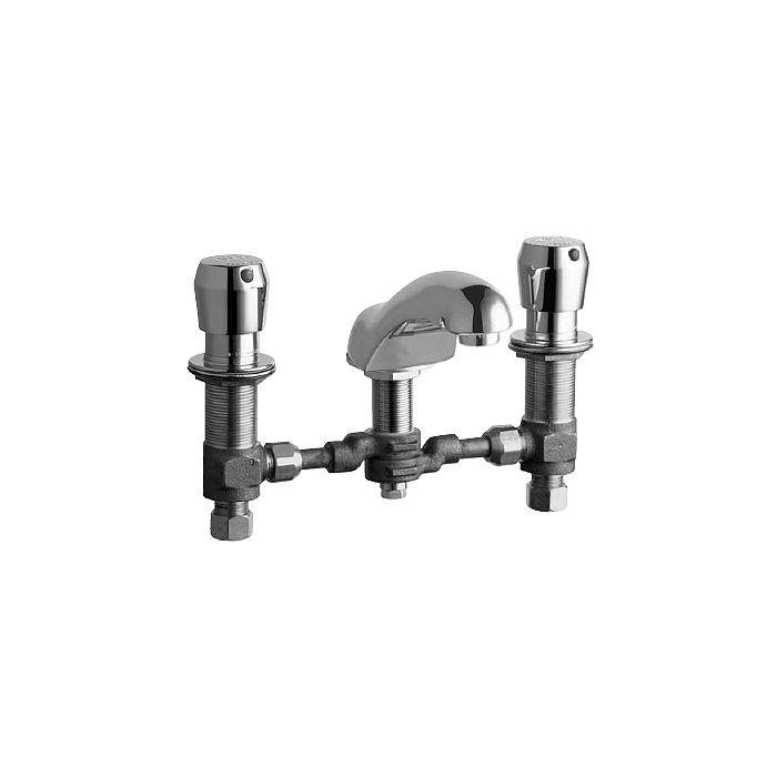 Chicago Faucets No. 404-665SWCP, polished chrome plated solid brass body and spout. 5" C-C spout. 2.2 GPM pressure compensating aerator outlet. Tapered metering handle with color coded index buttons. MVP™ push button, 0.25 Gal/Cycle self-closing metering cartridge with square tapered broach feature to help facilitate handle removal. 8" swivel connetion centers with 1/2" NPSM threaded inlets with coupling nuts for connection to 3/8" or 1/2" standard flexible risers. Mounting hardware included. This product meets ADA requirements and is tested and certified to industry standards: ASME A112.18.1, CSA B125 and NSF 61, section 9.