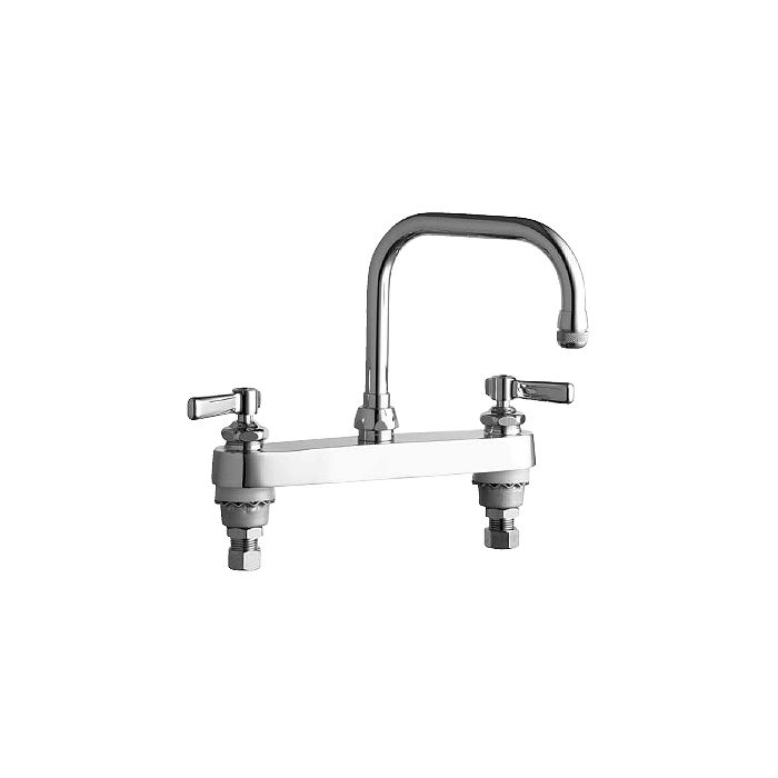 Chicago Faucets No. 527-CP, polished chrome plated solid brass body and spout. 6 1/4" C-C rigid/swing field convertible double bend spout. Quixtop screen outlet. 2-3/8" metal lever handles with eight-point tapered broach and secured, color-coded index buttons. Quaturn™ quarter-turn renewable compression cartridge designed to close with water pressure, with square tapered broach feature to help facilitate handle removal. 8" rigid valve body centers with 1/2" NPSM threaded inlets with coupling nuts for connection to 3/8" or 1/2" standard flexible risers. Mounting hardware included. This product meets ADA requirements and is tested and certified to industry standards: ASME A112.18.1, NSF 61 Sec. 9, and CSA B125.