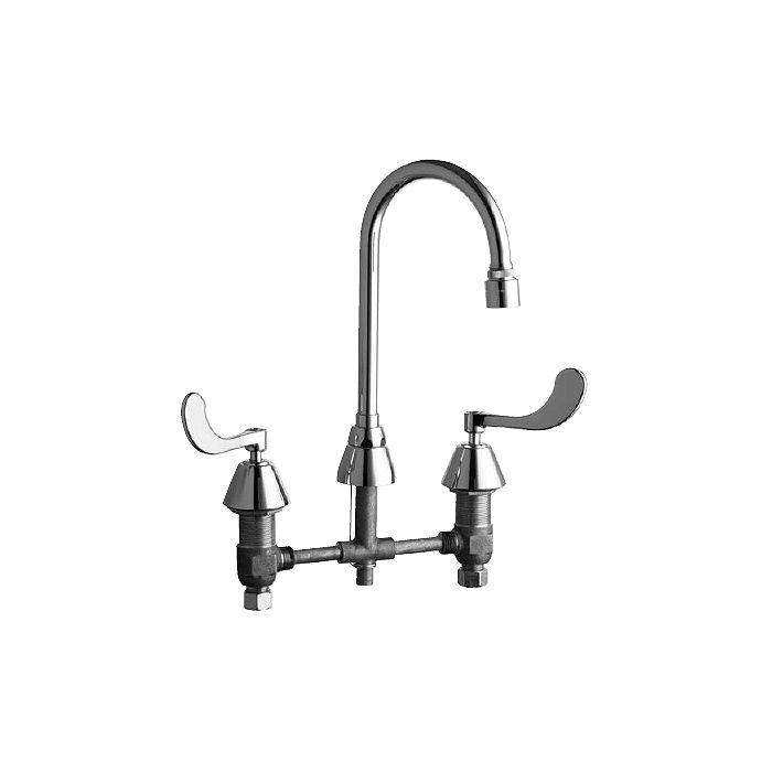 Chicago Faucets No. 786-E29VPCP, Polished chrome plated solid brass body and spout. 5 1/4" C-C rigid/swing field convertible gooseneck spout. 2.2 GPM vandal resistant pressure compensating laminar flow outlet. 4" wristblade handles with eight point tapered broach and secured color coded index buttons. Quaturn™ quarter-turn renewable compression cartridge designed to close with water pressure with square tapered broach feature to help facilitate handle removal. 8" rigid valve body centers with 1/2" NPSM threaded inlets with coupling nuts for connection to 3/8" or 1/2" standard flexible risers. Mounting hardware included. This product meets ADA requirements and is tested and certified to industry standards: ASME A112.18.1, NSF 61, Sec. 9 and CSA B125.