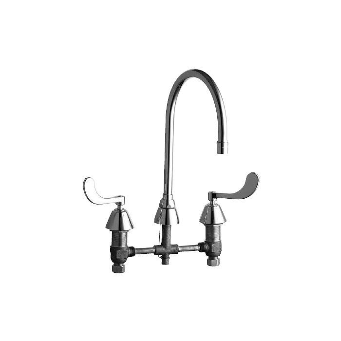 Chicago Faucets No. 786-GN8AE3CP, polished chrome plated solid brass body and spout. 8" C-C rigid/swing field convertible gooseneck spout. 2.2 GPM pressure compensating aerator outlet. 4" wristblade handles with eight point tapered broach and secured, color-coded index buttons. Quaturn™ quarter-turn renewable compression cartridge designed to close with water pressure, with square tapered broach feature to help facilitate handle removal. 8" rigid valve body centers with 1/2" NPSM threaded inlets with coupling nuts for connection to 3/8" or 1/2" standard flexible risers. Mounting hardware included. This product meets ADA requirements and is tested and certified to industry standards: ASME A112.18.1, NSF 61 Sec. 9, and CSA B125.