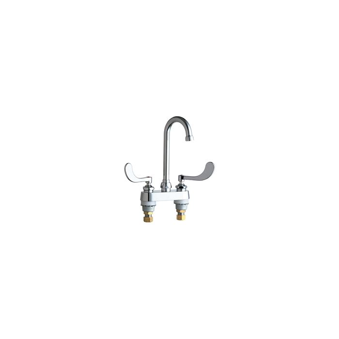 Chicago Faucets No. 895-317E29VPCP, Polished chrome plated solid brass construction with integral shanks. 3 1/2" C-C rigid/swing field convertible gooseneck spout. 2.2 GPM vandal resistant pressure compensating aerator outlet. 4" Wristblade handles with eight point tapered broach, secured color coded index buttons. Quaturn™ quarter-turn renewable compression cartridge designed to close with water pressure with square tapered broach feature to help facilitate handle removal. Inlet shanks contain standard 1/2" NPSM threaded inlets with coupling nuts for connection to 3/8" or 1/2" standard flexible risers. Mounting hardware included. This product meets ADA requirements and is tested and certified to industry standards: ASME A112.18.1, NSF 61, Sec. 9 and CSA B125.