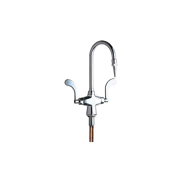 Chicago Faucets No. 929-317CP polished chrome plated solid brass construction. 5 1/4" center to center rigid / swing field convertable gooseneck spout. Full flow laboratory serrated nozzle. 4" metal wristblade handle(s) with sixteen point tapered broach and secured blue and red buttons. Quaturn™ rebuildable compression cartridge, opens and closes 90°, closes with water pressure, features square tapered stem. Integral inlet shank(s) contains standard 3/8" O.D. Copper supply tubes. Mounting hardware included. This product meets ADA ANSI/ICC A117.1 requirements and is tested and certified to industry standards: ASME A112.18.1, CSA B125.1, and Certified to NSF/ANSI 61, Section 9 by CSA.