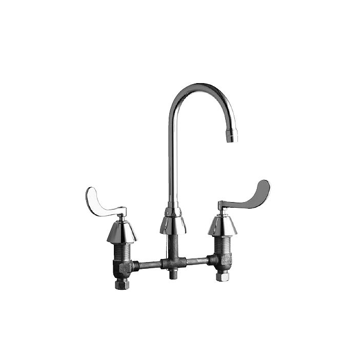 Chicago Faucets No. 786-E3-319CP, Polished chrome plated solid brass body and spout. 5 1/4" C-C rigid/swing field convertible gooseneck spout. 2.2 GPM pressure compensating aerator outlet. 6" elbow blade handles with eight point tapered broach and secured color coded index buttons. Quaturn™ quarter-turn renewable compression cartridge designed to close with water pressure with square tapered broach feature to help facilitate handle removal. 8" rigid valve body centers with 1/2" NPSM threaded inlets with coupling nuts for connection to 3/8" or 1/2" standard flexible risers. Mounting hardware included. This product meets ADA requirements and is tested and certified to industry standards: ASME A112.18.1, NSF 61, Sec. 9 and CSA B125.
