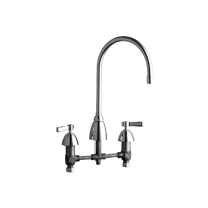 Chicago Faucets No. 201-AGN8AE3CP, polished chrome plated solid brass body and spout. 8" C-C rigid/swing field convertible gooseneck spout. 2.2 GPM pressure compensating aerator outlet. 2-3/8" lever handles with eight point tapered broach and secured, color-coded index buttons. Quaturn™ quarter-turn renewable compression cartridge designed to close with water pressure, with square tapered broach feature to help facilitate handle removal. 8" rigid valve body centers with 1/2" NPSM threaded inlets with coupling nuts for connection to 3/8" or 1/2" standard flexible risers. Mounting hardware included. This product meets ADA requirements and is tested and certified to industry standards: ASME A112.18.1, NSF 61 Sec. 9, and CSA B125.
