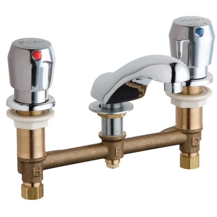 Chicago Faucets No. 404-VE2805-665CP, polished chrome plated solid brass body and spout. 5" C-C spout. .5 GPM pressure compensating vandal resistant spray outlet. Tapered vandal-resistant metering handle with color coded index buttons. MVP™ push button, 0.25 Gal/cycle self-closing metering cartridge. 8" rigid valve body centers with 1/2" NPSM threaded inlets with coupling nuts for connection to 3/8" or 1/2" standard lavatory risers. Mounting hardware included. This product meets ADA requirements and is tested and certified to industry standards: ASME A112.18.1, NSF 61 Sec. 9, and CSA B125.