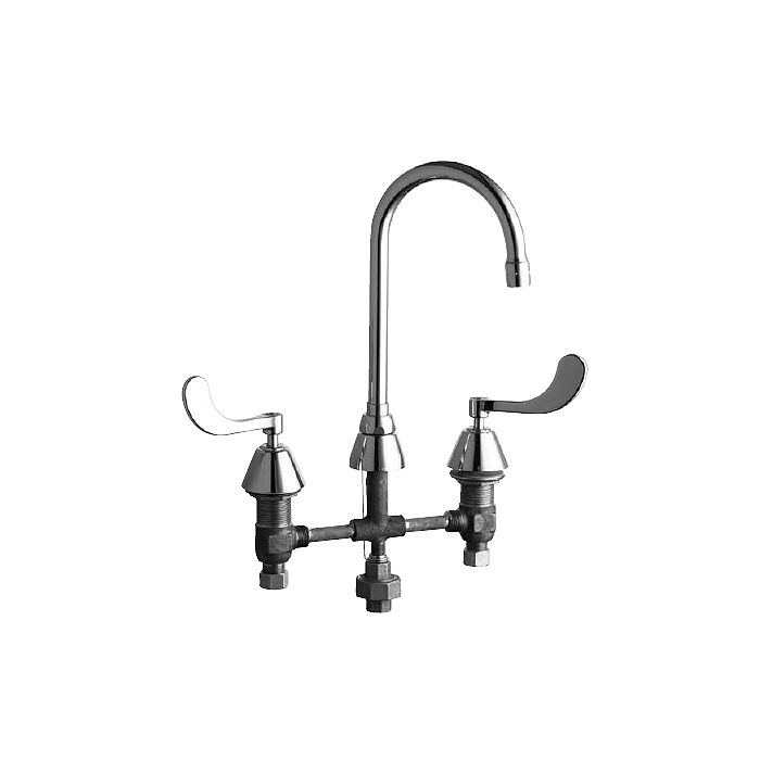Chicago Faucets No. 786-TWGN2AE3CP, polished chrome plated solid brass body and spout. 5-1/4" C-C rigid/swing field convertible gooseneck spout. 2.2 GPM pressure compensating aerator outlet. 4" wristblade handles with eight-point tapered broach and secured, color-coded index buttons. Quaturn™ quarter-turn renewable compression cartridge designed to close with water pressure, with square tapered broach feature to help facilitate handle removal. 8" rigid valve body centers with third water inlet connection for use with pedal valves. 1/2" NPSM threaded inlets with coupling nuts for connection to 3/8" or 1/2" standard flexible risers. Mounting hardware included. This product meets ADA requirements and is tested and certified to industry standards: ASME A112.18.1, NSF 61 Sec. 9, and CSA B125.