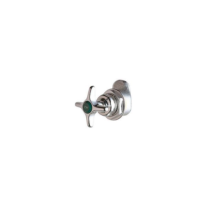 Chicago Faucets No. 914-CP polished chrome plated solid brass construction. 2 1/2" metal cross handle(s) with eight point tapered broach and cw button. Slow compression rebuildable cartridge, opens and closes 360° for fine adjustment, closes with water pressure, features square tapered stem. Integral inlet shank(s) contains standard 3/8" NPT female thread inlet. Mounting hardware included. This product is tested and certified to industry standards: ASME A112.18.1, CSA B125.1, and Certified to NSF/ANSI 61, Section 9 by CSA.