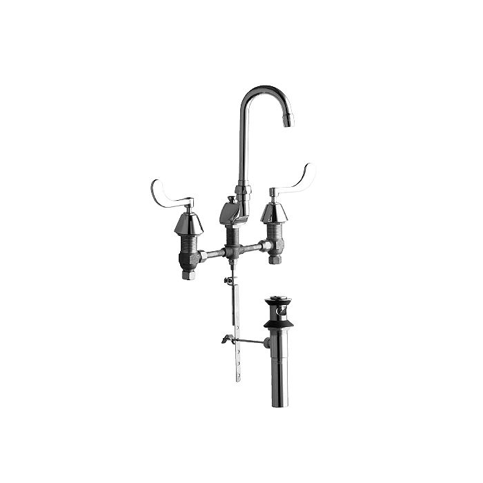 Chicago Faucets No. 794-317CP, polished chrome plated solid brass body and spout. 3-1/2" C-C rigid/swing field convertible gooseneck spout. 2.2 GPM pressure compensating aerator outlet. 4" wristblade handles with eight-point tapered broach and secured, color-coded index buttons. Quaturn™ quarter turn renewable compression cartridge designed to close with water pressure, with square tapered broach feature to help facilitate handle removal. 8" rigid valve body centers with 1/2" NPSM threaded inlets with coupling nuts for connection to 3/8" or 1/2" standard flexible risers. Includes 1 1/4" O.D. pop-up waste. Mounting hardware included. This product meets ADA requirements nd is tested and certified to industry standards: ASME A112.18.1, NSF 61 Sec. 9, and CSA B125.