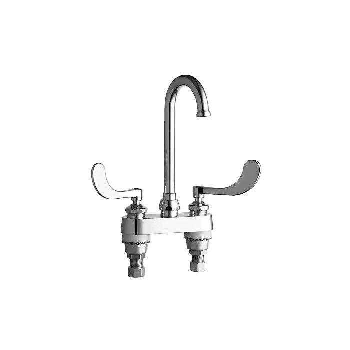 Chicago Faucets No. 895-317FCCP, Polished chrome plated solid brass construction with integral shanks. 3 1/2" C-C rigid/swing field convertible gooseneck spout. 1.6 GPM laminar flow control. 4" Wristblade handles with eight point tapered broach and secured color coded index buttons. Quaturn™ quarter-turn renewable compression cartridge designed to close with water pressure with square tapered broach feature to help facilitate handle removal. Inlet shanks contain standard 1/2" NPSM threaded inlets with coupling nuts for connection to 3/8" or 1/2" standard flexible risers. Mounting hardware included. This product meets ADA requirements and is tested and certified to industry standards: ASME A112.18.1, NSF 61, Sec. 9 and CSA B125.