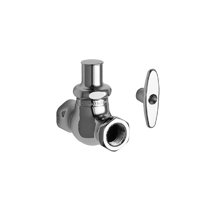 Chicago Faucets No. 45-LKCCP, Polished chrome plated solid cast brass construction. 2 1/4" loose key handle with loose key cap and plug button. Slow compression renewable cartridge designed to close with water pressure with square tapered broach feature to help facilitate handle removal. Built-in integral check, 1⁄ 2" NPT inlet and 1/2" NPT outlet. This product is tested and certified to industry standards: ASME A112.18.1, CSA B125 and NSF 61, section 9.