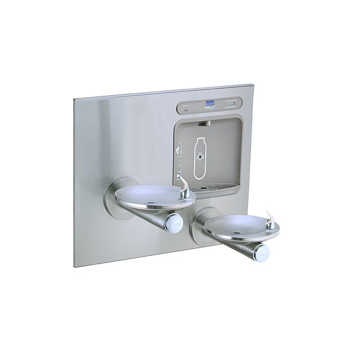 Architectural fountains with integral bottle filling station. LZWS-EDFPBM117K shall deliver non-chilled drinking water unless connected to a remote water chiller. Units shall be stainless steel construction with plastic ABS alcove. Sensor-activation with an auto 20-second shut-off timer. Shall include Green Ticker™ displaying count of plastic bottles saved from waste. Bottle filler shall provide 1.5 gpm flow rate with laminar flow to minimize splashing and 1.1 gpm flow rate when connected to a remote water chiller. Shall include the WaterSentry® Plus 3000-gallon capacity filter, certified to NSF/ANSI 42 and 53, with visual monitor to indicate when replacement is necessary. Shall include integrated silver ion anti-microbial protection in key areas. Unit shall meet ADA guidelines. Unit shall be lead-free design which is certified to NSF/ANSI 61 and 372 and meets Federal and State low-lead requirements. Unit shall be certified to UL399 and CAN/CSA 22.2 No. 120.