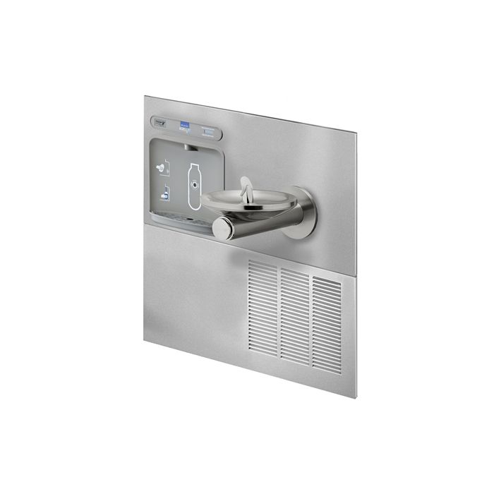 In-wall LZWS-ERPB8-RF Retro-fit system will update existing refrigerated Bi-Level SwirlFlo® installations with an integrated Bottle Filler system. Units shall be stainless steel construction with plastic ABS alcove. Sensor activation with an auto 20-second shut-off timer. Shall include GreenTicker™ displaying count of plastic bottles saved from waste. Bottle filler shall provide 1.1 gpm flow rate with laminar flow to minimize splashing. Shall include integrated silver ion anti-microbial protection in key areas. Bottle filler meets ADA guidelines for reach range; fountain meets ADA guidelines for wheelchair access. Unit shall be lead-free design which is certified to NSF/ANSI 61 and 372 and meets Federal and State low-lead requirements. Unit shall be certified to UL399 and CAN/CSA 22.2 No. 120.