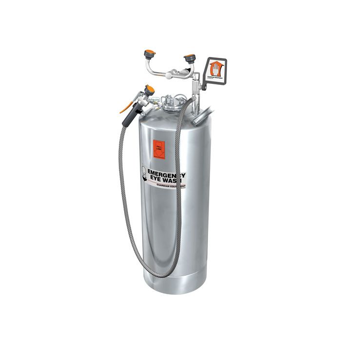 The Guardian G1522 Portable Eyewash 15 Gallon with Drench Hose is ideal where a continuous supply of potable water is not available. The fifteen gallon units provide approximately 12.8 usable gallons of water for effective rinsing of the eyes, face or body. NOTE: Under ANSI Z358.1-2004, drench hose units supplement, but do not replace, other types of emergency equipment.