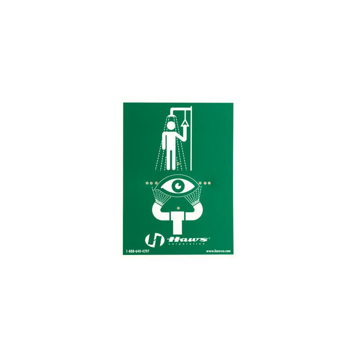 The *Haws SP178 Drench Shower / Eyewash Sign* is a vertical combination drench shower and eyewash sign constructed of green plastic. 8" x 10-3/4" H.