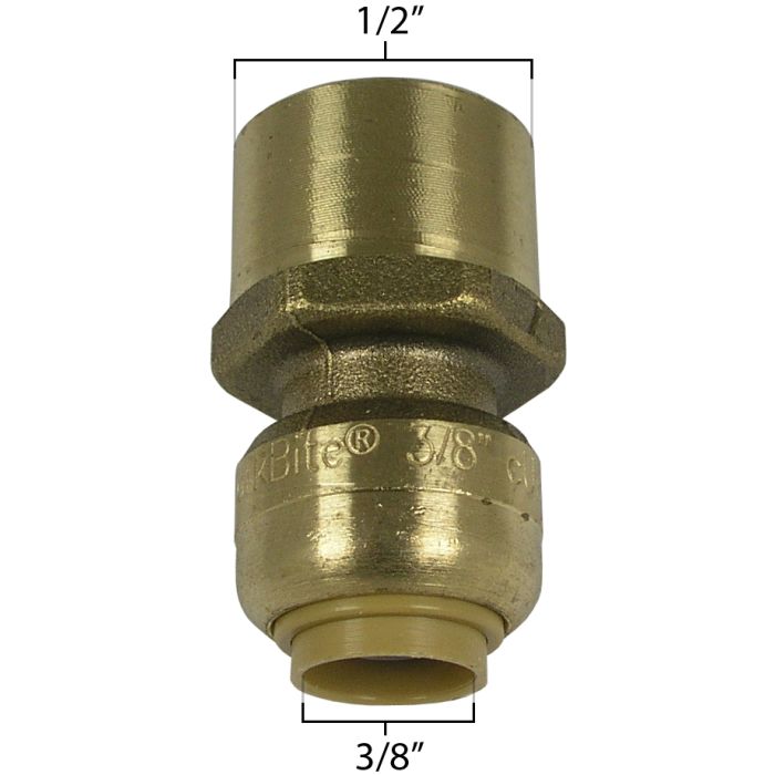 *SharkBite U070LF Female Reducing Connector 3/8" x 1/2" FNPT*. SharkBite push-fit fittings are the fastest, easiest way to join copper, CPVC and PEX in any combination - wet or dry. Simply cut the pipe, de-burr and push on the fitting. SharkBite fittings can easily be removed and are reusable. This product is *lead free*.