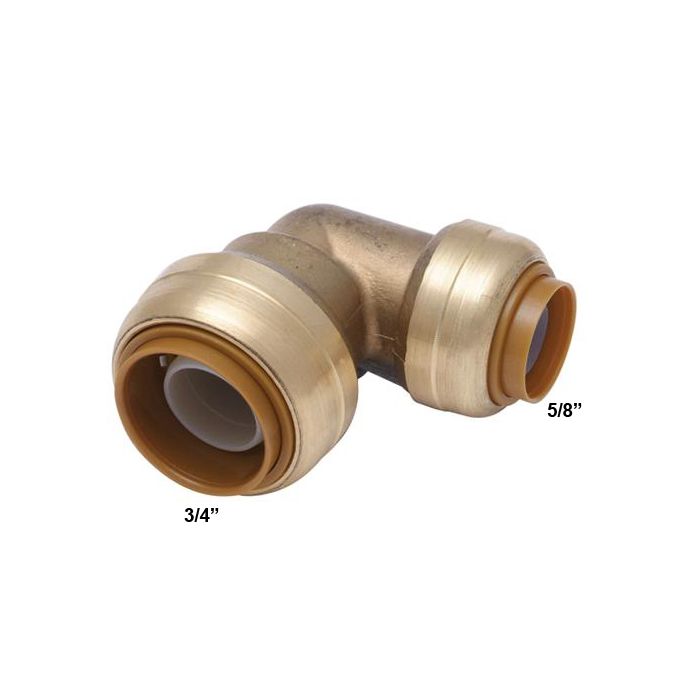 *SharkBite U273 Reducing Elbow 3/4” x 5/8”*. SharkBite push-fit fittings are the fastest, easiest way to join copper, CPVC and PEX in any combination - wet or dry. Simply cut the pipe, de-burr and push on the fitting. SharkBite fittings can easily be removed and are reusable.