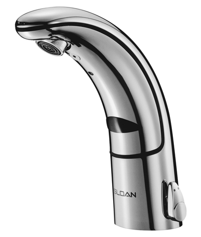 Sloan Optima I.Q. EAF-150 sensor faucets are ADA compliant, battery-powered, and have an i.q. click feature (a button that extends from the underside of the faucet spout that allows the user to place the faucet into the following function modes: Continuous Run, Temporary Off, Permanent Off and Auto Set Range Adjustment.)