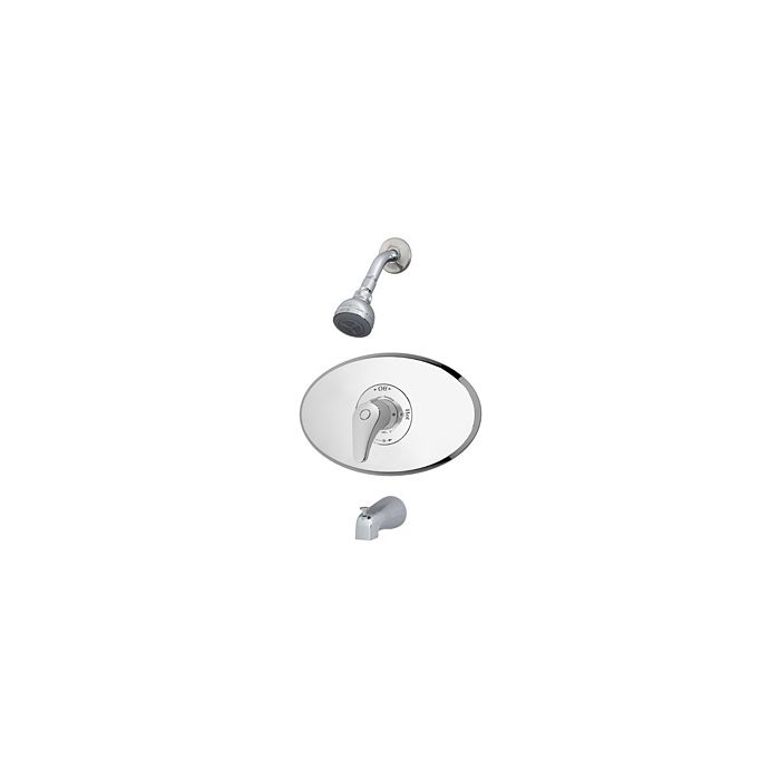 Deluxe Temptrol Pressure Balancing mixing valve with lever handle and adjustable stop screw to limit handle turn. Remodel cover plate and dial. Clear-Flo shower head with arm and flange. Diverter tub spout. Polished chrome finish.