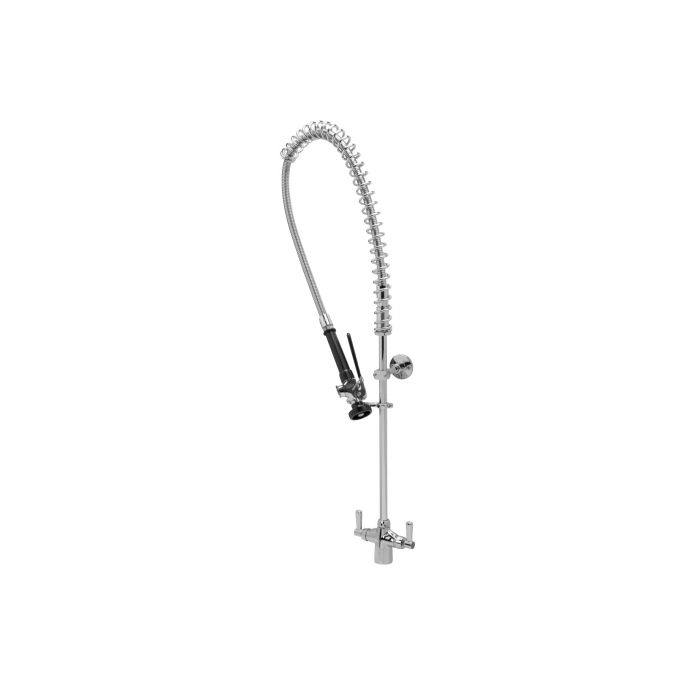 The Zurn Z826X1 is a polished chrome plated deck mounted pre-rinse faucet with an integral shank, quarter turn ceramic disc cartridges, a mixing yoke with 1/2” check stop inlets and 2-1/2” [64mm] vandal resistant color coded metal lever handles. Unit is furnished with a 24 ”[610mm] riser, a 36” [914mm] stainless steel spring hose, a self-closing 1.24 GPM @ 60 psi (4.7 L/min. @ 400 kPa) pre-rinse hand held valve with an insulated 6”[152mm] handle, a stay open clip, a protective bumper spray head, a pipe support and a hose hook
