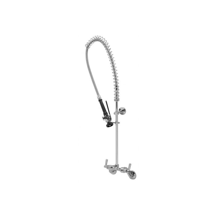 Polished chrome-plated pre-rinse faucet with quarter turn ceramic disc cartridges, 2-1/2" [64mm] long swivel inlets (with integral stops) providing adjustable centers from 4" [102mm] to 8-3/8" [213mm], check stops and 2-1/2” [64mm] vandal resistant color-coded metal lever handles. Unit is furnished with a 24” [610mm] riser, a 36” [914mm] stainless steel spring hose, a self-closing, 1.24 GPM @ 60 psi (4.7 l/min. @ 400 kPa) pre-rinse hand held valve with an insulated handle, a stay open clip, a protective bumper spray head, a pipe support and a hook.