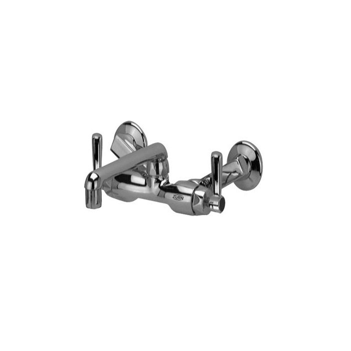 Polished chrome-plated cast brass service sink faucet with quarter turn ceramic disc cartridges, 2-1/2" [64mm] long swivel inlets (with ntegral stops) providing adjustable centers from 4" [102mm] to 8-3/8" [213mm] and a 6" [152mm] cast brass swing spout with a 2.2 GPM [8.3 L] pressure compensating aerator (complying with ANSI A112.18.1 Standard for flow). Unit is provided with 2-1/2" [64mm] vandal-resistant color-coded metal lever handles.