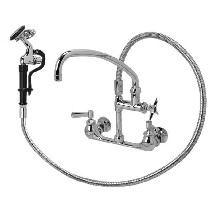 Polished chrome plated cast brass 8” [203mm] pre-rinse faucet with quarter turn ceramic disc cartridges, 3/8 [10mm] short swivel inlets with check stops providing adjustable centers from 7-1/4” [184mm] to 8-3/4” [222mm] and 2-1/2” [64mm] vandal resistant color-coded metal lever handles. Unit is furnished with a single valve Adapta faucet with a 9-1/2” [241mm] swing spout and single screen outlet, a 60” [152cm] stainless steel hose, an angled 1.24 GPM @ 60 psi (4.7 L/min. @ 400 kPa) self-closing pre-rinse hand held valve with an insulated handle, a stay open clip, a protective bumper spray head and a wall hook.